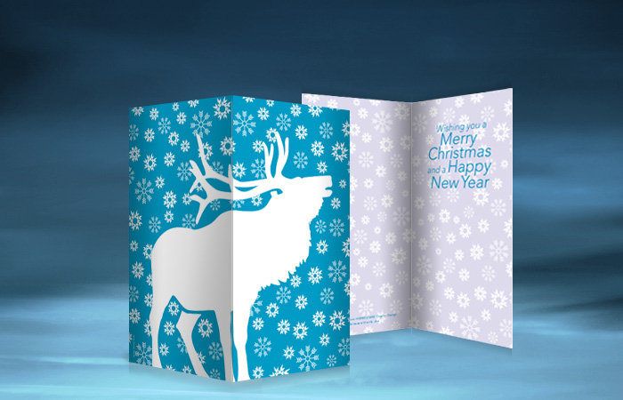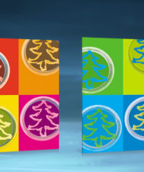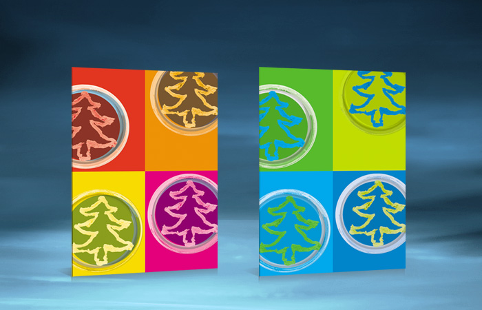 Weihnachtskarten, die mit Hilfe einer in Weihnachtsbaum-Form gezüchteten Pilzkultur gestaltet wurden.